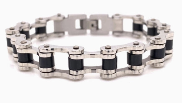 Looking for a unique and stylish bracelet that shows off your love of biking? Then the Stainless Steel and Black Bike Chain Bracelet is the perfect accessory for you! This bracelet features a bike chain design with black accents and a snap lock clasp. Ideal for retailers catering to men and women with an appreciation for both style and durability, this bracelet is a versatile addition that will quickly become a customer favorite.