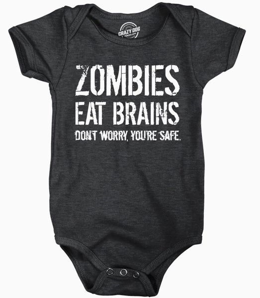 Add a dash of humor to your baby's wardrobe with our 'Zombies Eat Brains Don't Worry You're Safe' bodysuit.  This bodysuit is not just a funny statement but also a comfortable wear for your little one. It's a testament to our belief in celebrating individuality and bringing joy to the everyday. So, let your baby join the movement and bring smiles with every wear.