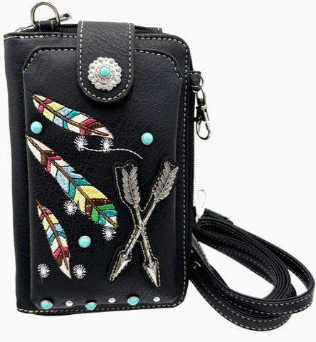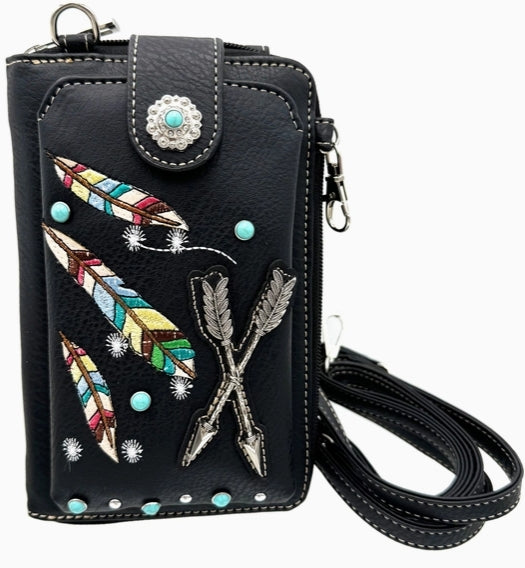 Introducing our Arrows and Embroidered Feather Western Crossbody Phone Wallet, a stylish and practical accessory that combines the convenience of a phone wallet with western style. The front pocket, measuring 7.5 by 4 inches and secured by a magnetic flap, is perfect for carrying your smartphone. The size should accommodate most popular smartphones, even the new iPhones. Additionally, the attached zipper wallet provides convenient storage for your cards and cash, while the crossbody strap allows for hands-free and convenient use.