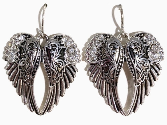 Beautiful angel wing carved silver earring with rhinestones and crystal. The angel wing symbolizes protection, purity, love, and harmony. Hook style clasp with stopper Earring Length: 1.5" Heart Pendant Length: 3"
